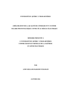 Dadjom Tchamani, Andy Keliams (2026). Amélioration de la qualité de l’énergie d’un système solaire photovoltaïque connecté au réseau électrique. Mémoire. Trois-Rivières, Université du Québec à Trois-Rivières, 87 p.