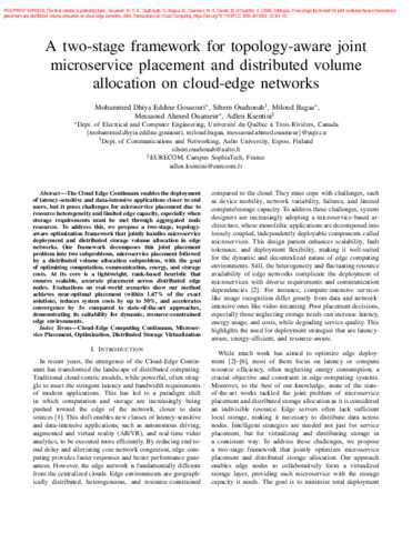 Gouaouri, M., Gouaouri, M. D. E., Ouahouah, S., Bagaa, M., Ouameur, M. A., Massicotte, D. et Ksentini, A. (2026). Diktopos: A two-stage framework for joint container-based microservice placement and distributed volume allocation on cloud-edge networks. IEEE Transactions on Cloud Computing . ISSN 2168-7161 DOI 10.1109/TCC.2026.3676203