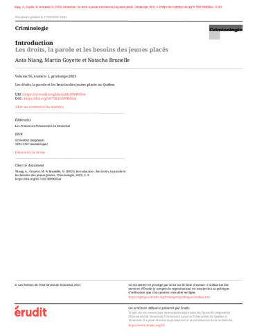 Niang, A., Goyette, M. et Brunelle, N. (2023). Introduction : les droits, la parole et les besoins des jeunes placés. Criminologie, 56 (1). pp. 5-9. ISSN 0316-0041 DOI 10.7202/1099003ar