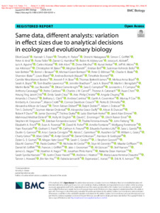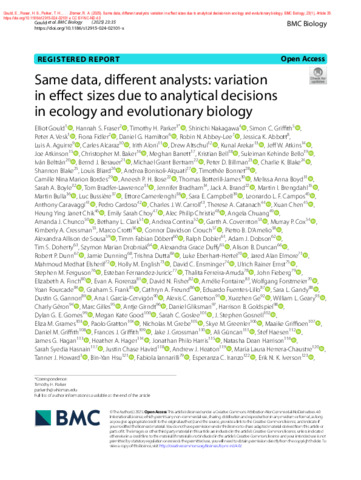 Gould, E., Fraser, H. S., Parker, T. H., Nakagawa, S., Griffith, S. C., Vesk, P. A., Fidler, F., Hamilton, D. G., Abbey-Lee, R. N., Abbott, J. K., Aguirre, L. A., Alcaraz, C., Aloni, I., Altschul, D., Arekar, K., Atkins, J. W., Atkinson, J., Baker, C. M., Barrett, M., Bell, K., Bello, S. K., Beltrán, I., Berauer, B. J., Bertram, M. G., Billman, P. D., Blake, C. K., Blake, S., Bliard, L., Bonisoli-Alquati, A., Bonnet, T., Bordes, C. N. M., Bose, A. P. H., Botterill-James, T., Boyd, M. A., Boyle, S. A., Bradfer-Lawrence, T., Bradham, J., Brand, J. A., Brengdahl, M. I., Bulla, M., Bussière, L., Camerlenghi, E., Campbell, S. E., Campos, L. L. F., Caravaggi, A., Cardoso, P., Carroll, C. J. W., Catanach, T. A., Chen, X., Chik, H. Y. J., Choy, E. S., Christie, A. P., Chuang, A., Chunco, A. J., Clark, B. L., Contina, A., Covernton, G. A., Cox, M. P., Cressman, K. A., Crotti, M., Crouch, C. D., D’Amelio, P. B., de Sousa, A. A., Döbert, T. F., Dobler, R., Dobson, A. J., Doherty, T. S., Drobniak, S. M., Duffy, A. G., Duncan, A. B., Dunn, R. P., Dunning, J., Dutta, T., Eberhart-Hertel, L., Elmore, J. A., Elsherif, M. M., English, H. M., Ensminger, D. C., Ernst, U. R., Ferguson, S. M., Fernandez-Juricic, E., Ferreira-Arruda, T., Fieberg, J., Finch, E. A., Fiorenza, E. A., Fisher, D. N., Fontaine, A., Forstmeier, W., Fourcade, Y., Frank, G. S., Freund, C. A., Fuentes-Lillo, E., Gandy, S. L., Gannon, D. G., García-Cervigón, A. I., Garretson, A. C., Ge, X., Geary, W. L., Géron, C., Gilles, M., Girndt, A., Gliksman, D., Goldspiel, H. B., Gomes, D. G. E., Good, M. K., Goslee, S. C., Gosnell, J. S., Grames, E. M., Gratton, P., Grebe, N. M., Greenler, S. M., Griffioen, M., Griffith, D. M., Griffith, F. J., Grossman, J. J., Güncan, A., Haesen, S., Hagan, J. G., Hager, H. A., Harris, J. P., Harrison, N. D., Hasnain, S. S., Havird, J. C., Heaton, A. J., Herrera-Chaustre, M. L., Howard, T. J., Hsu, B. Y., Iannarilli, F., Iranzo, E. C., Iverson, E. N. K., Jimoh, S. O., Johnson, D. H., Johnsson, M., Jorna, J., Jucker, T., Jung, M., Kačergytė, I., Kaltz, O., Ke, A., Kelly, C. D., Keogan, K., Keppeler, F. W., Killion, A. K., Kim, D., Kochan, D. P., Korsten, P., Kothari, S., Kuppler, J., Kusch, J. M., Lagisz, M., Lalla, K. M., Larkin, D. J., Larson, C. L., Lauck, K. S., Lauterbur, M. E., Law, A., Léandri-Breton, D. J., Lembrechts, J. J., L’Herpiniere, K., Lievens, E. J. P., de Lima, D. O., Lindsay, S., Luquet, M., MacLeod, R., Macphie, K. H., Magellan, K., Mair, M. M., Malm, L. E., Mammola, S., Mandeville, C. P., Manhart, M., Manrique-Garzon, L. M., Mäntylä, E., Marchand, P., Marshall, B. M., Martin, C. A., Martin, D. A., Martin, J. M., Martinig, A. R., McCallum, E. S., McCauley, M., McNew, S. M., Meiners, S. J., Merkling, T., Michelangeli, M., Moiron, M., Moreira, B., Mortensen, J., Mos, B., Muraina, T. O., Murphy, P. W., Nelli, L., Niemelä, P., Nightingale, J., Nilsonne, G., Nolazco, S., Nooten, S. S., Novotny, J. L., Olin, A. B., Organ, C. L., Ostevik, K. L., Palacio, F. X., Paquet, M., Parker, D. J., Pascall, D. J., Pasquarella, V. J., Paterson, J. H., Payo-Payo, A., Pedersen, K. M., Perez, G., Perry, K. I., Pottier, P., Proulx, M. J., Proulx, R., Pruett, J. L., Ramananjato, V., Randimbiarison, F. T., Razafindratsima, O. H., Rennison, D. J., Riva, F., Riyahi, S., Roast, M. J., Rocha, F. P., Roche, D. G., Román-Palacios, C., Rosenberg, M. S., Ross, J., Rowland, F. E., Rugemalila, D., Russell, A. L., Ruuskanen, S., Saccone, P., Sadeh, A., Salazar, S. M., Sales, K., Salmón, P., Sánchez-Tójar, A., Santos, L. P., Santostefano, F., Schilling, H. T., Schmidt, M., Schmoll, T., Schneider, A. C., Schrock, A. E., Schroeder, J., Schtickzelle, N., Schultz, N. L., Scott, D. A., Scroggie, M. P., Shapiro, J. T., Sharma, N., Shearer, C. L., Simón, D., Sitvarin, M. I., Skupien, F. L., Slinn, H. L., Smith, G. P., Smith, J. A., Sollmann, R., Whitney, K. S., Still, S. M., Stuber, E. F., Sutton, G. F., Swallow, B., Taff, C. C., Takola, E., Tanentzap, A. J., Tarjuelo, R., Telford, R. J., Thawley, C. J., Thierry, H., Thomson, J., Tidau, S., Tompkins, E. M., Tortorelli, C. M., Trlica, A., Turnell, B. R., Urban, L., Van de Vondel, S., van der Wal, J. E. M., Van Eeckhoven, J., van Oordt, F., Vanderwel, K. M., Vanderwel, M. C., Vanderwolf, K. J., Vélez, J., Vergara-Florez, D. C., Verrelli, B. C., Vieira, M. V., Villamil, N., Vitali, V., Vollering, J., Walker, J., Walker, X. J., Walter, J. A., Waryszak, P., Weaver, R. J., Wedegärtner, R. E. M., Weller, D. L., Whelan, S., White, R. L., Wolfson, D. W., Wood, A., Yanco, S. W., Yen, J. D. L., Youngflesh, C., Zilio, G., Zimmer, C., Zimmerman, G. M. et Zitomer, R. A. (2025). Same data, different analysts: Variation in effect sizes due to analytical decisions in ecology and evolutionary biology. BMC Biology, 23 (1). Article 35. ISSN 1741-7007 DOI 10.1186/s12915-024-02101-x
