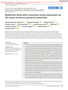 4. Synthesis. The mean and variation of canopy surface temperature were driven by differences in functional group composition (herbs- vs. grass dominance) and to a lesser extent by plant diversity. These effects were partly mediated the metrics of canopy structure but also by direct effects unrelated to the structural metrics considered. © 2021 The Authors. Journal of Ecology published by John Wiley & Sons Ltd on behalf of British Ecological Society