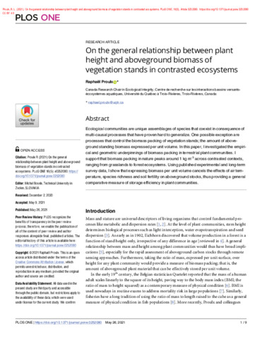 Proulx, R. L. (2021). On the general relationship between plant height and aboveground biomass of vegetation stands in contrasted ecosystems. PLoS ONE, 16 (5). Article 0252080. ISSN 1932-6203 DOI 10.1371/journal.pone.0252080