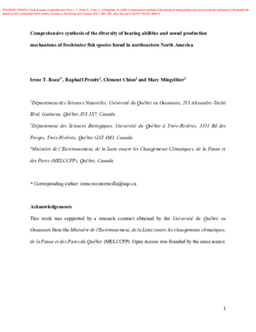 Roca, I. T., Proulx, R., Chion, C. et Mingelbier, M. (2025). Comprehensive synthesis of the diversity of hearing abilities and sound production mechanisms of freshwater fish species found in northeastern North America. Reviews in Fish Biology and Fisheries, 35 (3). pp. 1369-1382. ISSN 0960-3166 1573-5184 DOI 10.1007/s11160-025-09961-8