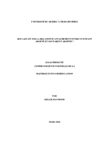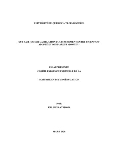 Raymond, Kellie (2026). Que sait-on sur la relation d’attachement entre un enfant adopté et son parent adoptif ? Essai. Trois-Rivières, Université du Québec à Trois-Rivières, 41 p.