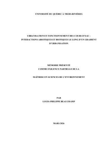 Beauchamp, Louis-Philippe (2026). Urbanisation et fonctionnement des cours d’eau : interactions abiotiques et biotiques le long d’un gradient d’urbanisation. Mémoire. Trois-Rivières, Université du Québec à Trois-Rivières, 76 p.