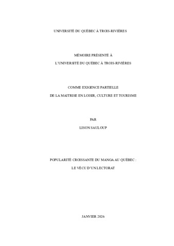 Sauloup, Lison Valérie Nathalie (2026). Popularité croissante du manga au Québec : le vécu d’un lectorat. Mémoire. Trois-Rivières, Université du Québec à Trois-Rivières, 140 p.