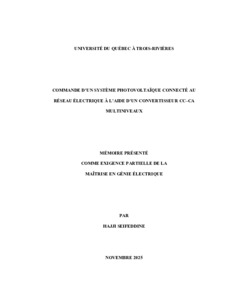 Hajji, Seifeddine (2025). Commande d’un système photovoltaïque connecté au réseau électrique à l’aide d’un convertisseur CC-CA multiniveaux. Mémoire. Trois-Rivières, Université du Québec à Trois-Rivières, 125 p.