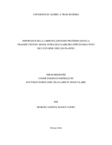 Fangue Yapseu, Georges Yannick (2026). Importance de la carbonylation des protéines dans la transduction du signal intracellulaire des espèces réactives de l’oxygène chez les plantes. Thèse. Trois-Rivières, Université du Québec à Trois-Rivières, 187 p.