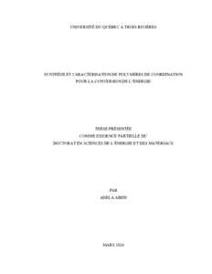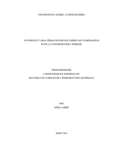 Abidi, Adela (2026). Synthèse et caractérisation de polymères de coordination pour la conversion de l’énergie. Thèse. Trois-Rivières, Université du Québec à Trois-Rivières, 274 p.