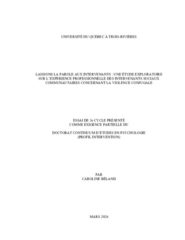 Béland, Caroline (2026). Laissons la parole aux intervenants : une étude exploratoire sur l’expérience professionnelle des intervenants sociaux communautaires concernant la violence conjugale. Essai. Trois-Rivières, Université du Québec à Trois-Rivières, 107 p.