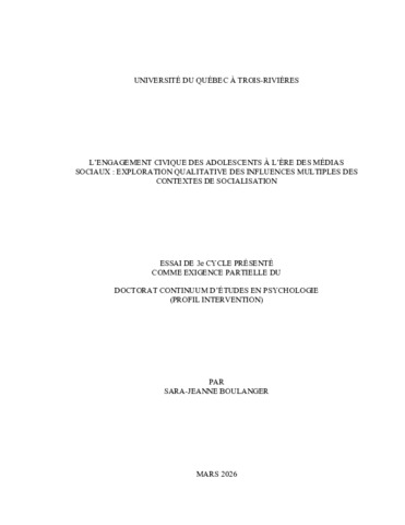 Boulanger, Sara-Jeanne (2026). L’engagement civique des adolescents à l’ère des médias sociaux : exploration qualitative des influences multiples des contextes de socialisation. Essai. Trois-Rivières, Université du Québec à Trois-Rivières, 140 p.