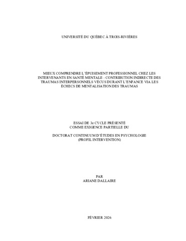 Dallaire, Ariane (2026). Mieux comprendre l’épuisement professionnel chez les intervenants en santé mentale : contribution indirecte des traumas interpersonnels vécus durant l’enfance via les échecs de mentalisation des traumas. Essai. Trois-Rivières, Université du Québec à Trois-Rivières, 62 p.