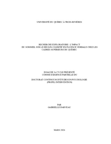 Darveau, Gabrielle (2026). Recherche exploratoire : l’impact du sommeil sur le déclin cognitif en fluence verbale chez les cadres supérieurs du Québec. Essai. Trois-Rivières, Université du Québec à Trois-Rivières, 103 p.