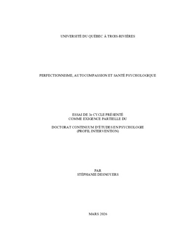 Desnoyers, Stéphanie (2026). Perfectionnisme, autocompassion et santé psychologique. Essai. Trois-Rivières, Université du Québec à Trois-Rivières, 51 p.