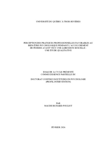 Richard-Pouliot, Maude (2026). Perception des pratiques professionnelles favorables au bien-être psychologique pendant l’accouchement de femmes ayant vécu une agression sexuelle : une étude qualitative. Essai. Trois-Rivières, Université du Québec à Trois-Rivières, 62 p.