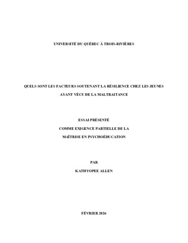 Allen, Kathyopée (2026). Quels sont les facteurs soutenant la résilience chez les jeunes ayant vécu de la maltraitance. Essai. Trois-Rivières, Université du Québec à Trois-Rivières, 35 p.
