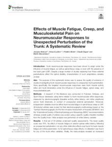 Abboud, J., Lardon, A., Boivin, F., Dugas, C. et Descarreaux, M. (2017). Effects of Muscle Fatigue, Creep, and Musculoskeletal Pain on Neuromuscular Responses to Unexpected Perturbation of the Trunk: A Systematic Review. Frontiers in Human Neuroscience, 10 (667). ISSN 1662-5161