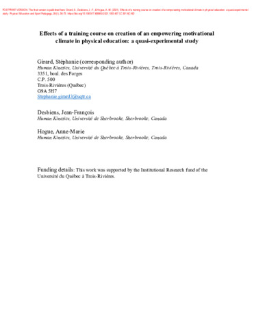 Girard, S., Desbiens, J.-F. et Hogue, A-M. (2021). Effects of a training course on creation of an empowering motivational climate in physical education: a quasi-experimental study. Physical Education and Sport Pedagogy, 28 (1). pp. 56-75. ISSN 1740-8989 DOI 10.1080/17408989.2021.1953457